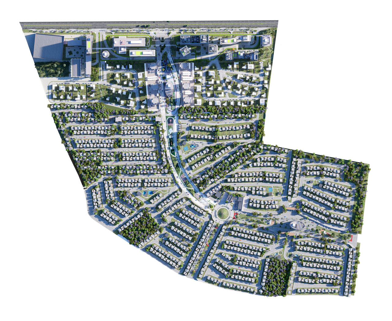 The buildings are interconnected by internal roads (for pedestrians and cyclists) and green public plazas, creating a well-equipped and walkable urban district.
