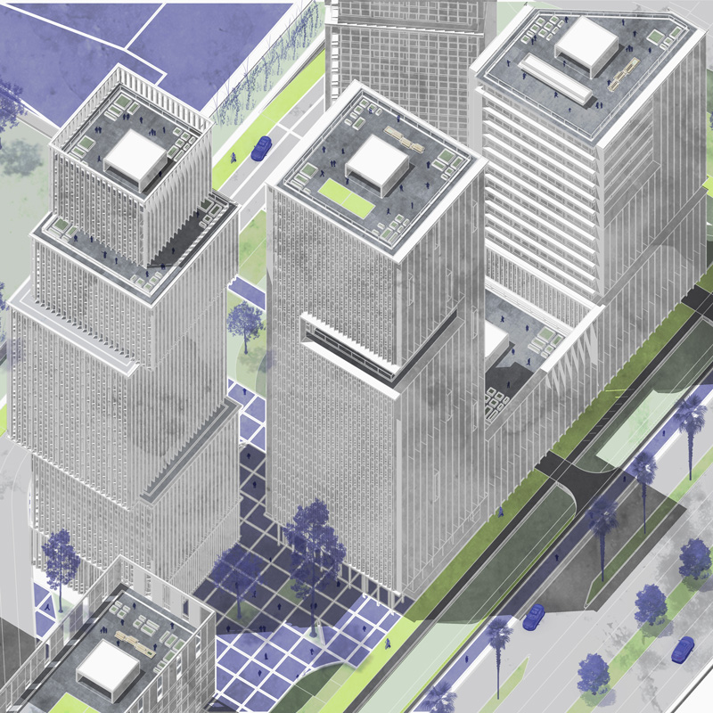 An open, compact, vertical, and dense district. The complex offers a vibrant urban experience by opening its spaces to the city and creating an area of urban vitality.