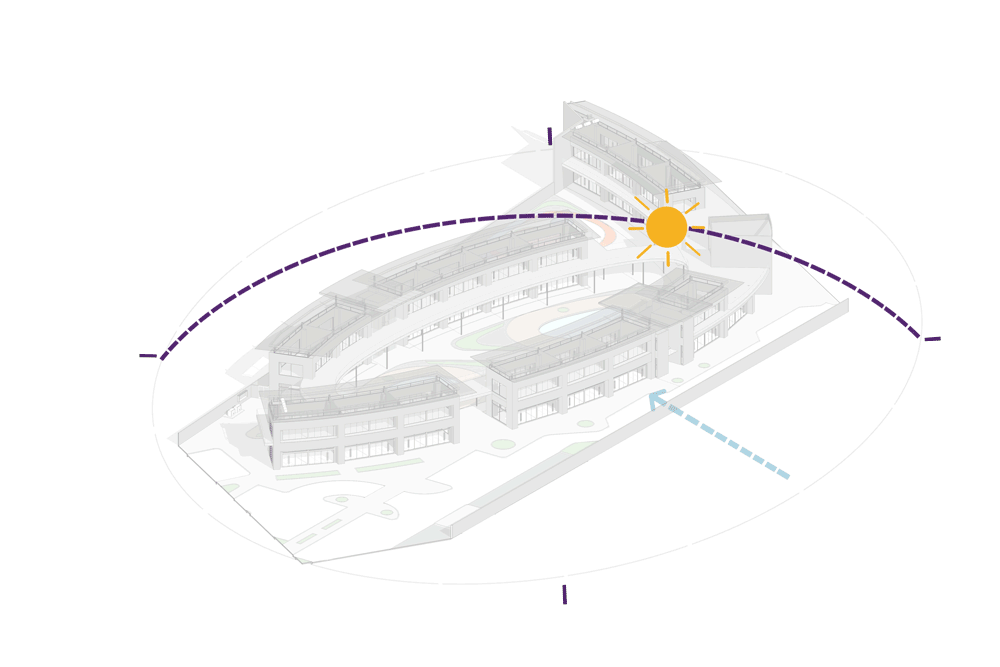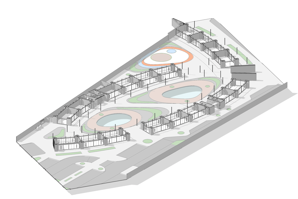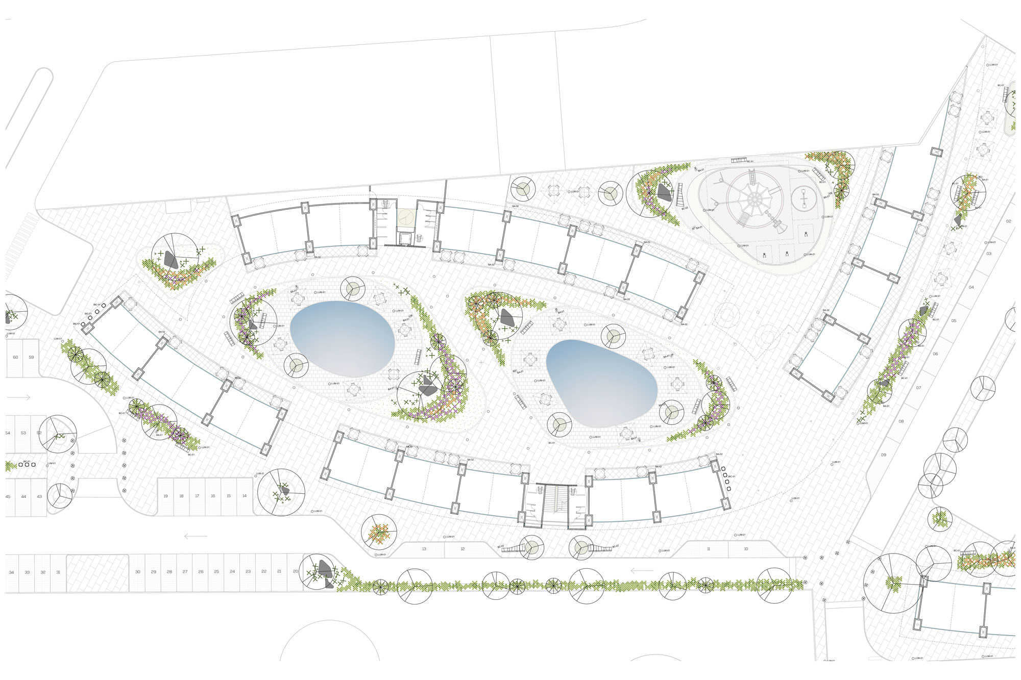 The architectural concept of the commercial plaza originates from an extruded, fragmented, and terraced oval shape with a central courtyard. This design aims to provide users with a peripheral view and to respond bioclimatically to the specific qualities of the site.